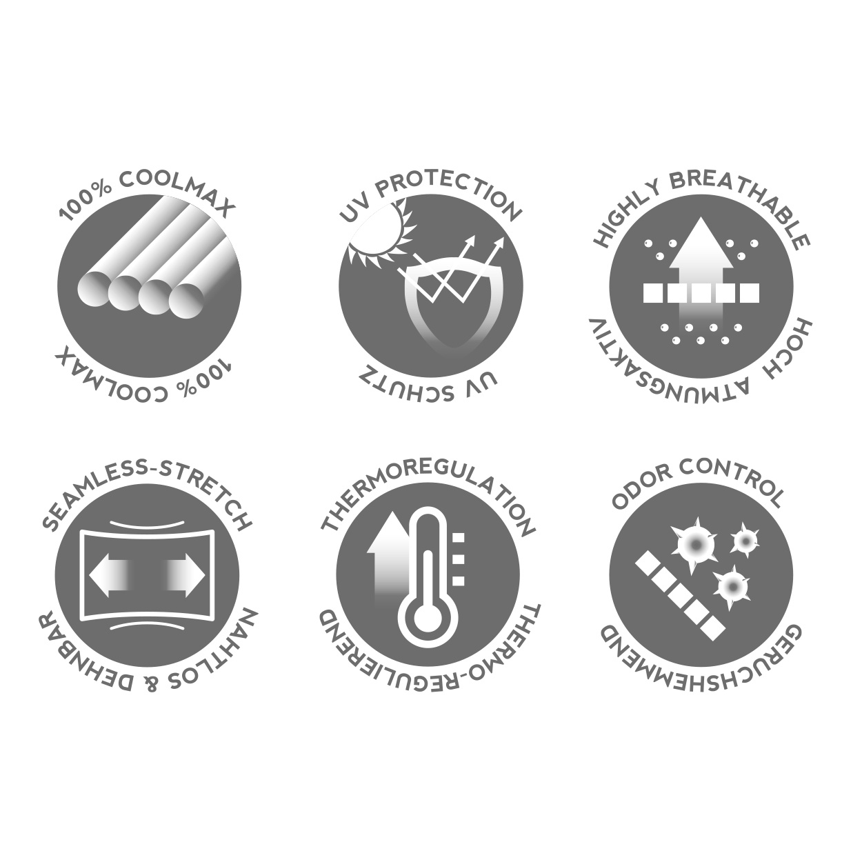 Bei Coolmax handelt es sich um eine Leistungsfaser, welche die Atmungsaktivität verstärkt und Feuchtigkeit besonders gut von der Haut weg transportiert. So wird bei jeglicher Aktivität ein angenehmes, kühles und trockenes Klima auf der Haut erzeugt.